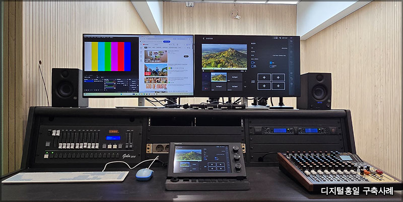 광주광역시에 위치하고 있는 조선이공대학교입니다. 이커머스 스튜디오를 구축하였습니다. ? 구축이 완료된 모습입니다. 이커머스 스튜디오에 설치 된 장비로는 통합방송시스템, PTZ카메라, 무선마이크, 콘덴서 마이크. 오디오 믹서, LED방송조명, 조명컨트롤러, 제어용PC, 모니터, 스피커등 라이브 방송에 필요한 모든 장비들을 사용했습니다. ? ? PTZ카메라는 OBSBOT Tiny 제품으로 했고, 비디오 삼각대는 리벡 TH-Z 입니다. ? ? 오디오 제어를 위한 디지털 믹서로 했습니다. 아날로그와 디지털의 복합적인 형태로 디지털 믹서를 다루기 어려운 초보자도 쉽게 사용하 수 있는 TASCAM MODEL12로 했습니다. ? ? 콘덴서 마이크는 가장 범용적으로 많이 사용되어지는 RODE 의 NT1 제품입니다. ? ? 이커머스 스튜디오인만큼 쇼핑라이브를 위한 마이크도 필요하겠죠~ 4채널 무선 핀 마이크로 준비 했습니다. 가성비가 뛰어나기로 유명한 KANALS BK4200 입니다. ? ? 조명 제어를 위한 DMX 컨트롤러입니다. GOBO200으로 하여 쉽게 사용할 수 있도록 했습니다. ?