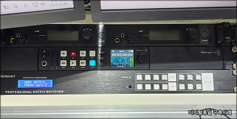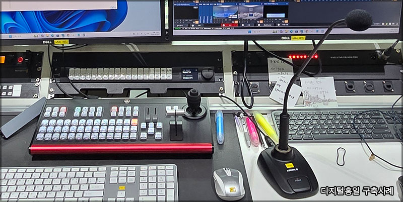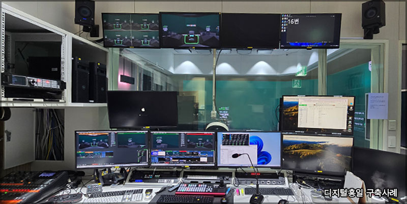 ? 기존에는 PGM이나 송출 모니터링이 옆쪽에 있었습니다. 연출이 모니터링하기에 어려운 위치라 변경해 드렸습니다. 전체적으로 기존장비 + 새로운장비로 구성된 모습입니다. ? ? 기존 통합방송시스템은 Wirecast 제품이었습니다. 사용하기에 조금 어려운면이 있고, 사용할 수 있는 엔지니어 구인난이 있어 가장 범용적으로 사용되어지고 있는 vMix 시스템으로 했습니다. ? ? vMix 시스템으로 변경한만큼 컨트롤러도 TYST TY-1500HD로 했습니다. 옆쪽에는 KANALS 구즈넥 마이크로 토크백도 가능하게 했습니다. ? ? 녹화한 영상을 실시간으로 업로드를 하는곳이라 별도의 녹화 시스템이 있습니다. ? ? 또한 백업용 녹화가 가능하도록 레코더를 추가하고 송출 시스템 (메인, 백업) 의 모니터링을 변환할 수 있도록 HDMI 매트릭스도 구성했습니다. ? 리뉴얼로 새롭게 들어간 장비 통합방송시스템 : vMix 시스템 (메인, 백업) 통합방송시스템 컨트롤러 : TY-15000HD, StreamDeck MK.2 백업 녹화시스템 : Hyperdeck Studio HD 녹화시스템 : OBS 시스템 매트릭스 : 4X4 HDMI 매트릭스 자막시스템 : 프로프리젠터 시스템(NDI) 오디오 모니터링 스피커 각종 컨버터 및 분배기